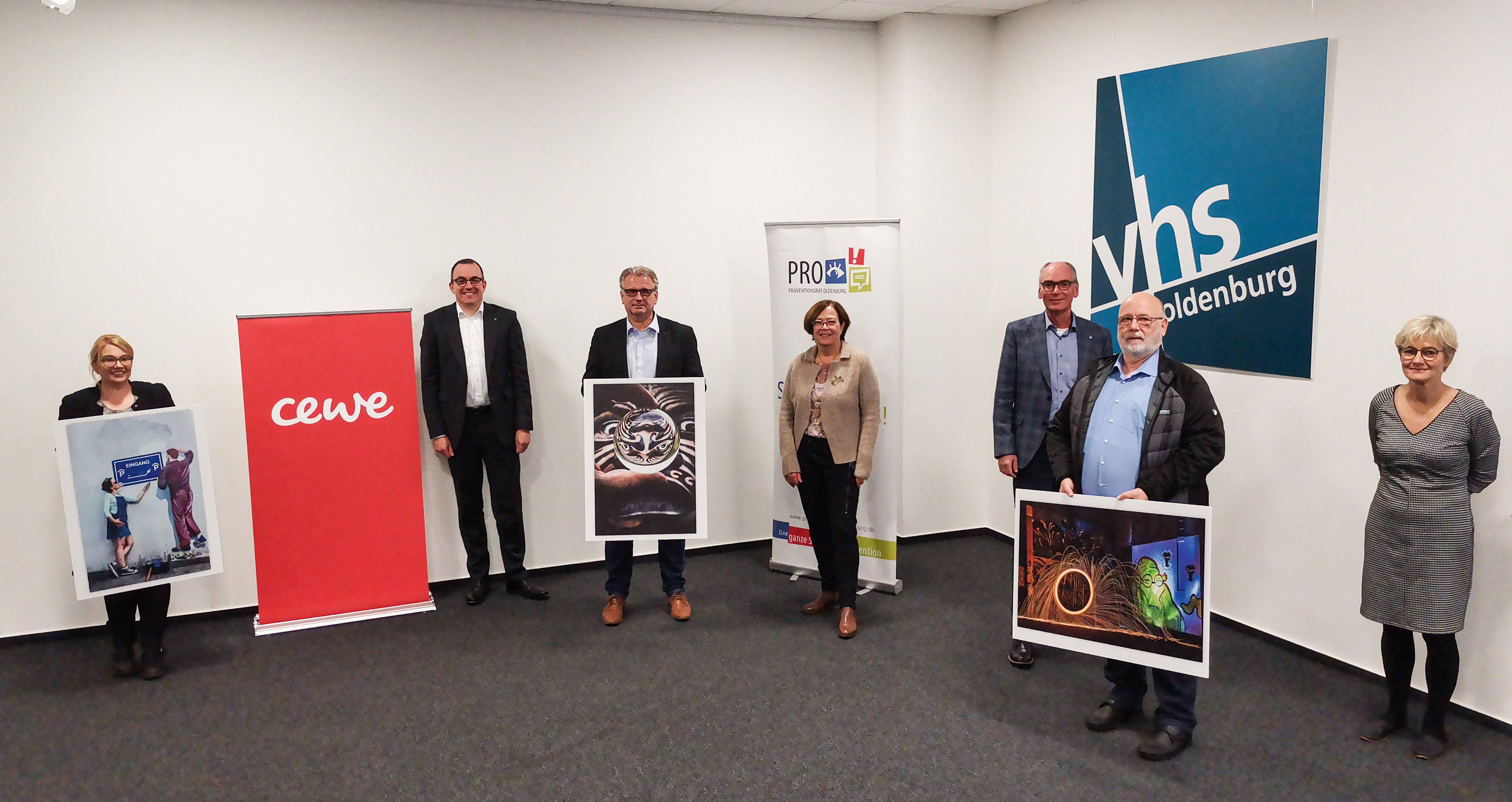 Andreas Gögel (Geschäftsführer der VHS Oldenburg) begrüßte gemeinsam mit Dagmar Sachse (Sozialdezernentin der Stadt Oldenburg), Ulrike Heinrichs (stellvertretende Vorsitzende des Präventionsrats Oldenburg) und Thomas Mehls (Vorstand CEWE) die Ausstellenden zur Eröffnung im LzO Forum der Volkshochschule. Melanie Wichering (Bildungsmanagement Kunst & Kultur, VHS Oldenburg) stellte die Werke der Fotograf*innen vor. Zehn von ihnen konnten sich über eine Auszeichnung freuen.