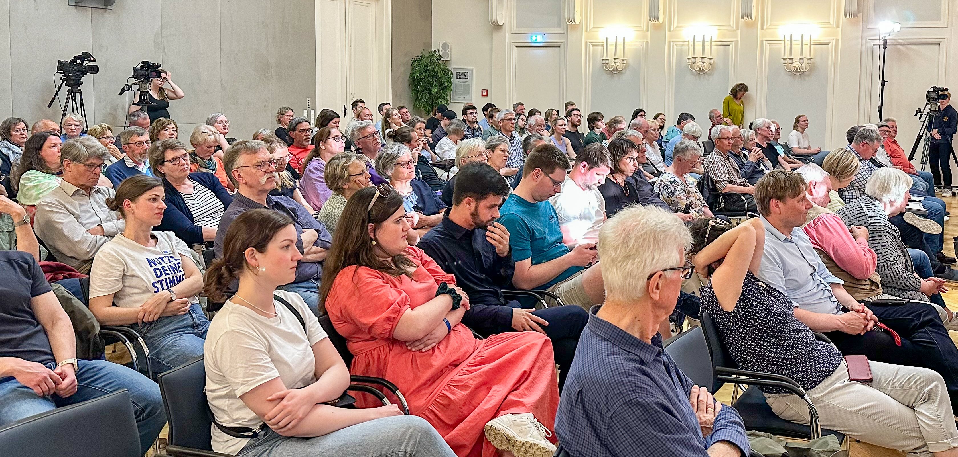 Auf dem Podium stellten sich Vertreter*innen der im Rat der Stadt Oldenburg vertretenen Parteien zunächst den Fragen von Moderator Peter Meiwald und anschließend in mehreren Runden den Fragen aus einem sehr interessierten Publikum. Dabei wurden die unterschiedlichen Positionen der Parteien deutlich. Themen waren u. a. Landwirtschaft, Klimawandel, Sozialsysteme, Wahlrecht, Transparenz von Entscheidungsprozessen, Schuldenaufnahme durch EU, Entwicklung einer Sozial-Union, Rechtsstaatlichkeit, Pressefreiheit, politische Bildung.