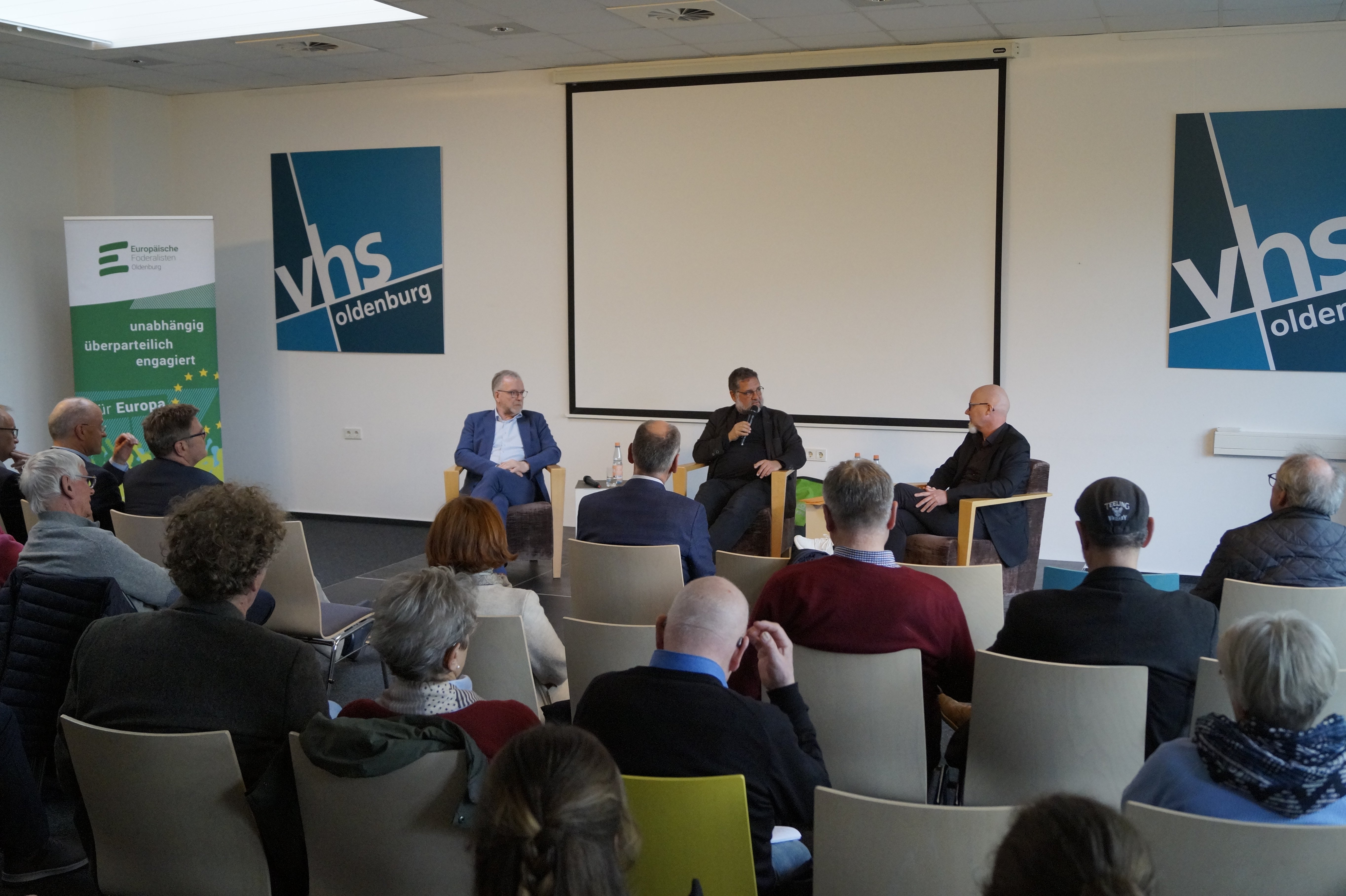 Das Grundgesetz wird 75 Jahre alt. Aus diesem Anlass luden wir am 18. April gemeinsam mit den Europäischen Föderalisten Oldenburg e. V. und dem Amt für regionale Landesentwicklung Weser-Ems zu einer Diskussion ein. Moderator Peter Meiwald sprach mit seinen Gästen Karsten Krogmann, Leiter Medien und Recherche beim WEISSEN RING, und Johann Kühme, Polizeipräsident a.D. Oldenburg, über die Bedeutung des Grundgesetzes in rechtspopulistischen Zeiten.