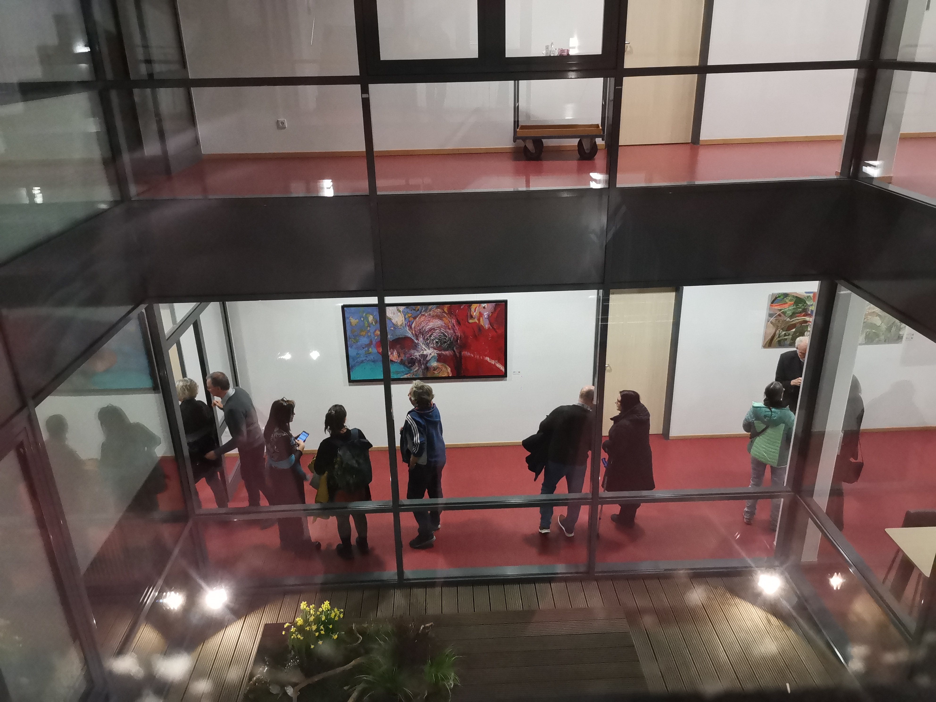 Am 2. Februar wurde die Ausstellung „Quelle und Ursprung“ vom VHS-Geschäftsführer Andreas Gögel und Kathrin Schöß (Vorstand BBK Oldenburg) eröffnet. Nach einer Einführung des Kunstvermittlers Dirk Meyer, hatten die Gäste der Eröffnung direkt in der Ausstellung ausgiebig Gelegenheit, sich mit den Orginalen vertraut zu machen und sich mit Gosia Echeneis auszutauschen.