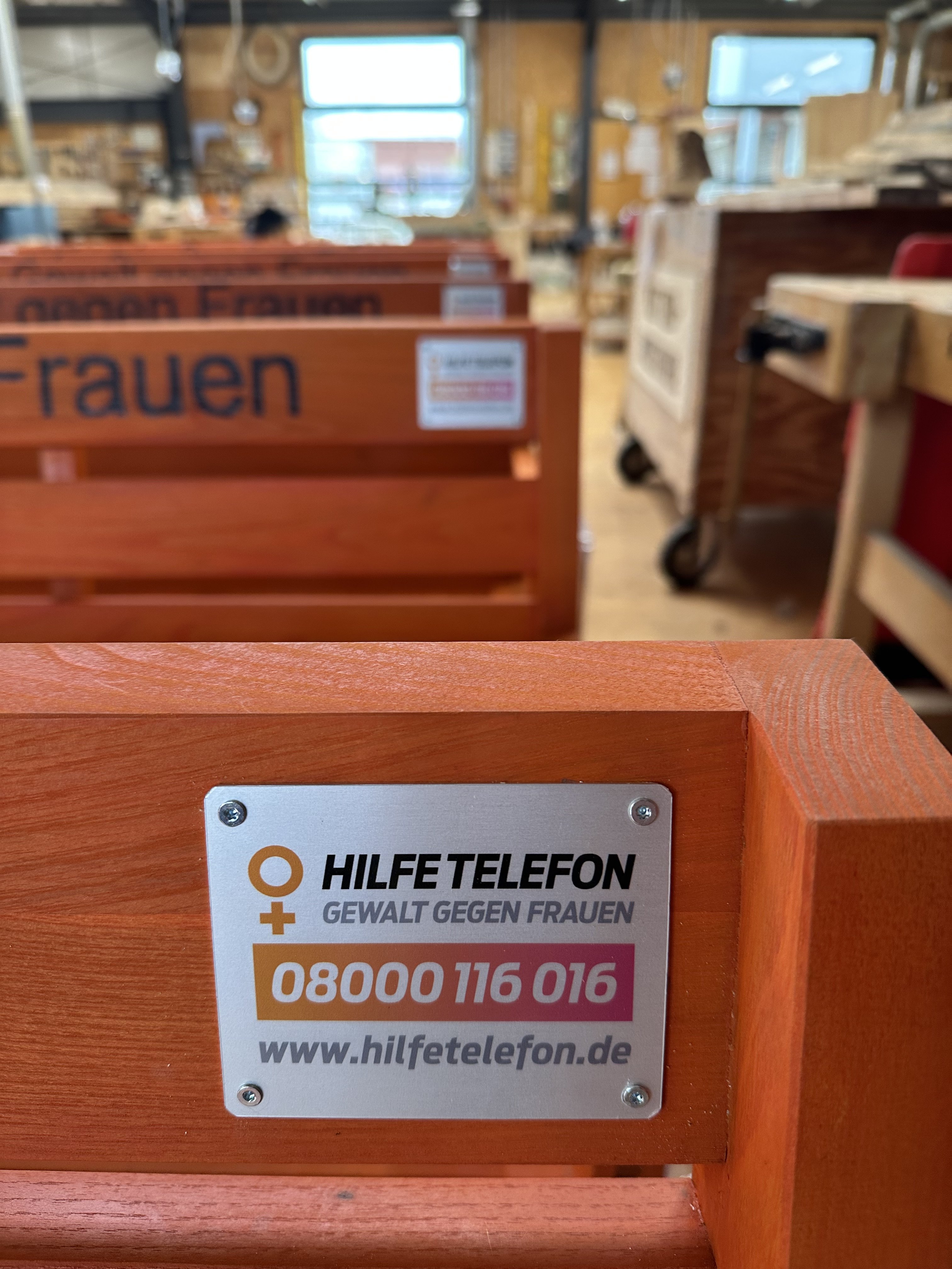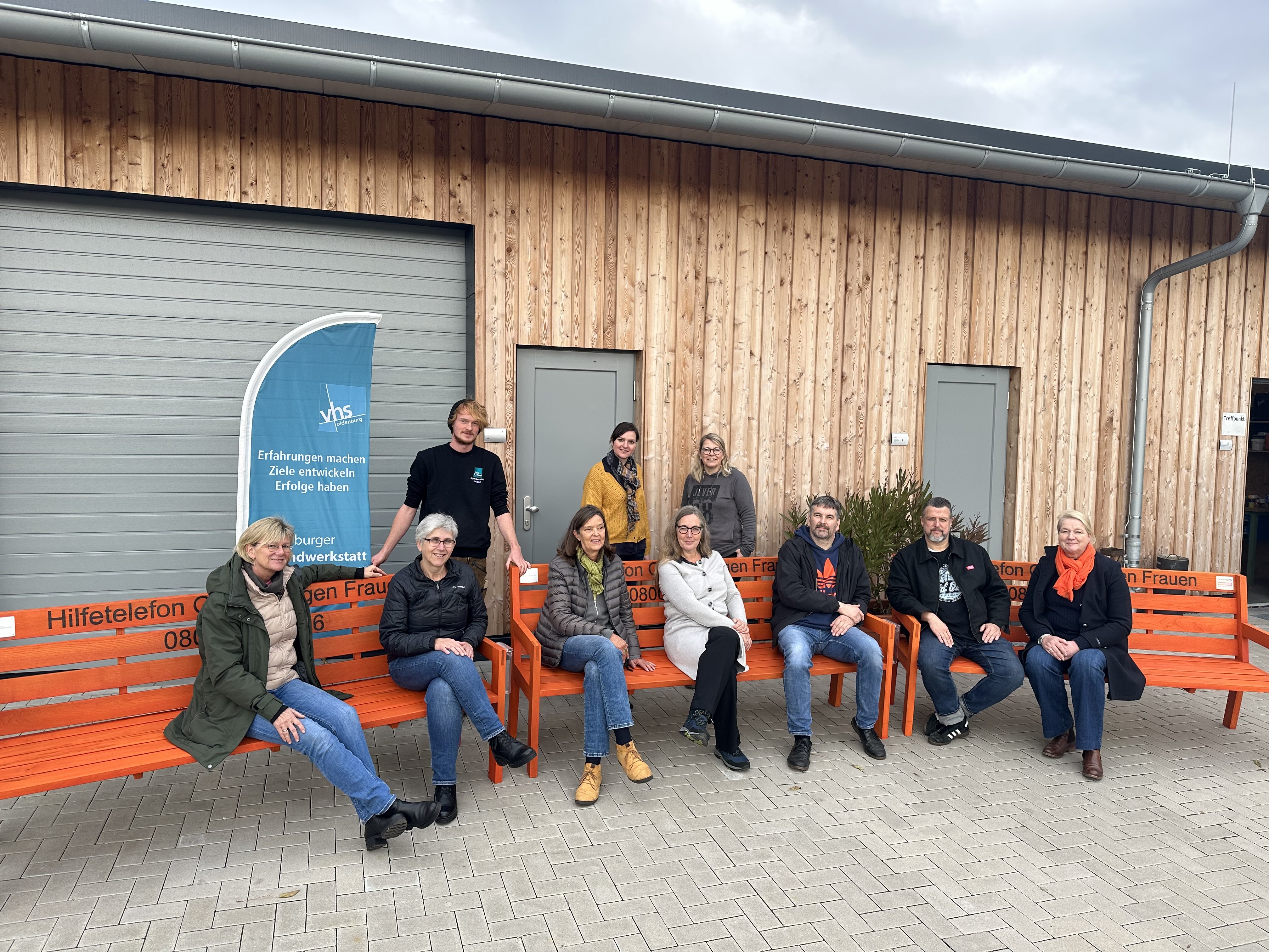 Sechs orangene Bänke informieren ab dem 25. November in Oldenburg über das Hilfetelefon 08000 116 016 und sensibilisieren damit gegen geschlechtsspezifische Gewalt an Frauen. Gebaut wurden sie von der Oldenburger Jugendwerkstatt, die für diese Aktion mit dem Gleichstellungsbüro der Stadt Oldenburg zusammenarbeitete. Anlässlich des Tags zur Beseitigung gegen Gewalt an Frauen, werden sie nun vor den vier Gemeinwesenarbeiten, beim Pflegekinderdienst und vor dem Innenstadtgeschäft „deine TONART“ aufgestellt. Für die Zukunft plant das Gleichstellungsbüro, die Anzahl der Bänke nach und nach auszubauen. Dafür ist es auf der Suche nach weiterer Unterstützung für die Finanzierung.