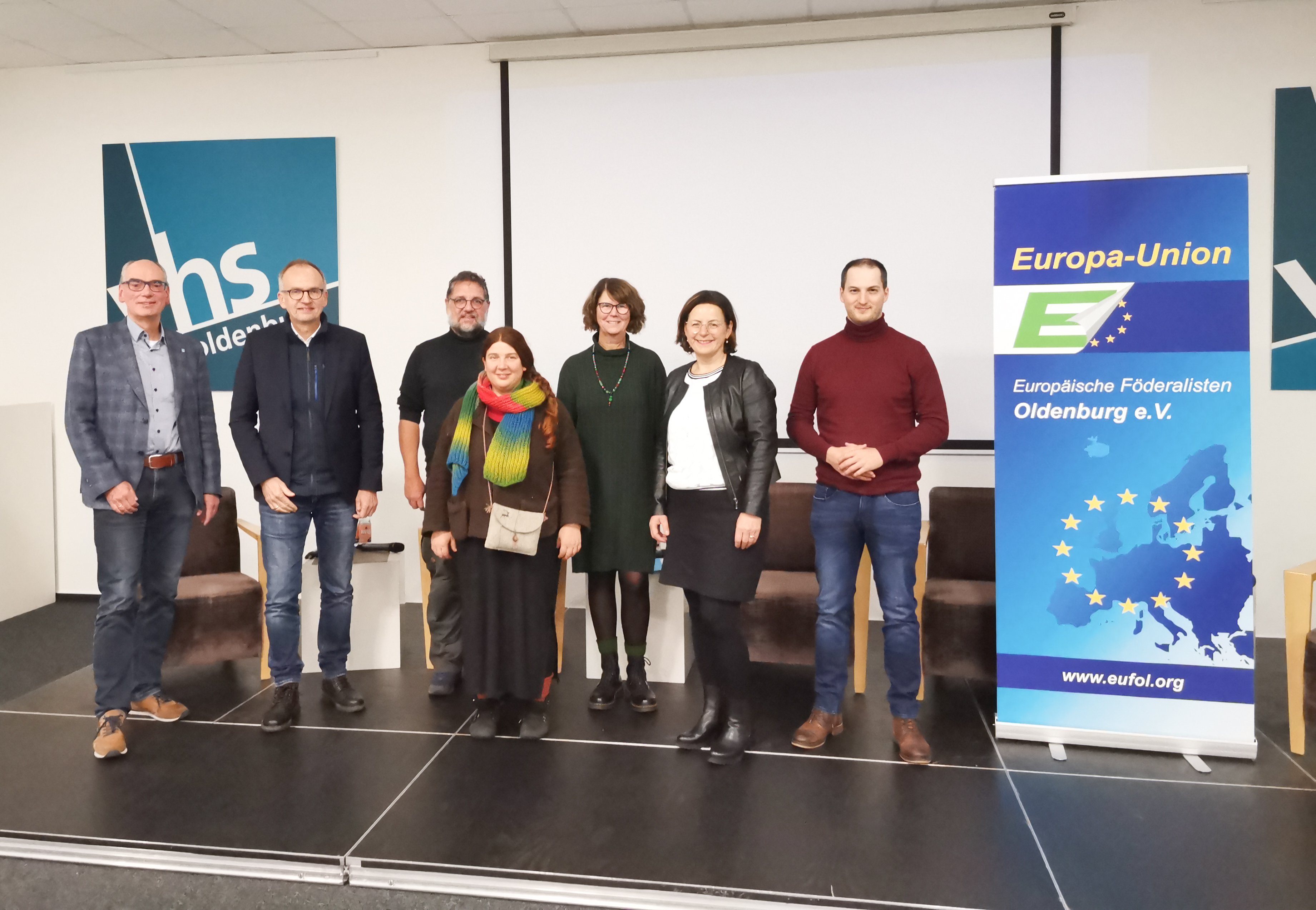 Über Klimaneutralität hinausdenken war das Thema unserer Diskussion am 8. Dezember – in Kooperation mit dem Amt für regionale Landesentwicklung Weser-Ems. Peter Meiwald, Vorsitzender der Europäischen Föderalisten Oldenburg e. V., war im Gespräch mit Sybille Eck (Projektleiterin EU-Taxomonie, EWE), Susanne Menge (MdB Bündnis 90/DieGrünen), Sonja Manderbach (Aktivistin Letzte Generation) und Kai Wehnemann (Umweltbundesamt).