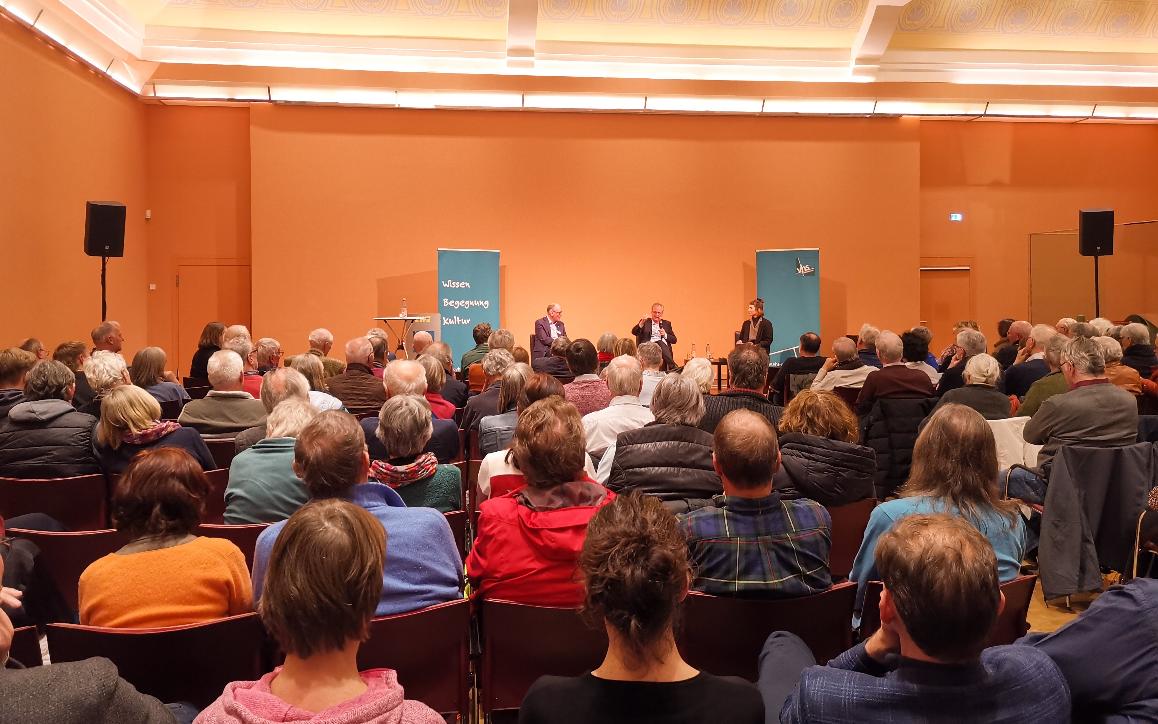In der anschließenden Diskussion mit VHS-Geschäftsführer Andreas Gögel und Larissa Helmke, Volontärin des Lokalsenders Oldenburg Eins, formulierte von Lucke einen Hoffnungsschimmer: Die Demonstrationen für die Demokratie sollten in Parteibeitritten und in ein Engagement für politische Ämter weitergetragen werden. Amtsträger*innen sollten vor Anfeindungen geschützt werden und die Parteien durchlässiger für junge Politiker*innen gestaltet werden. Nur belebte Parteien belebten auch Institutionen und stärkten die Demokratie.