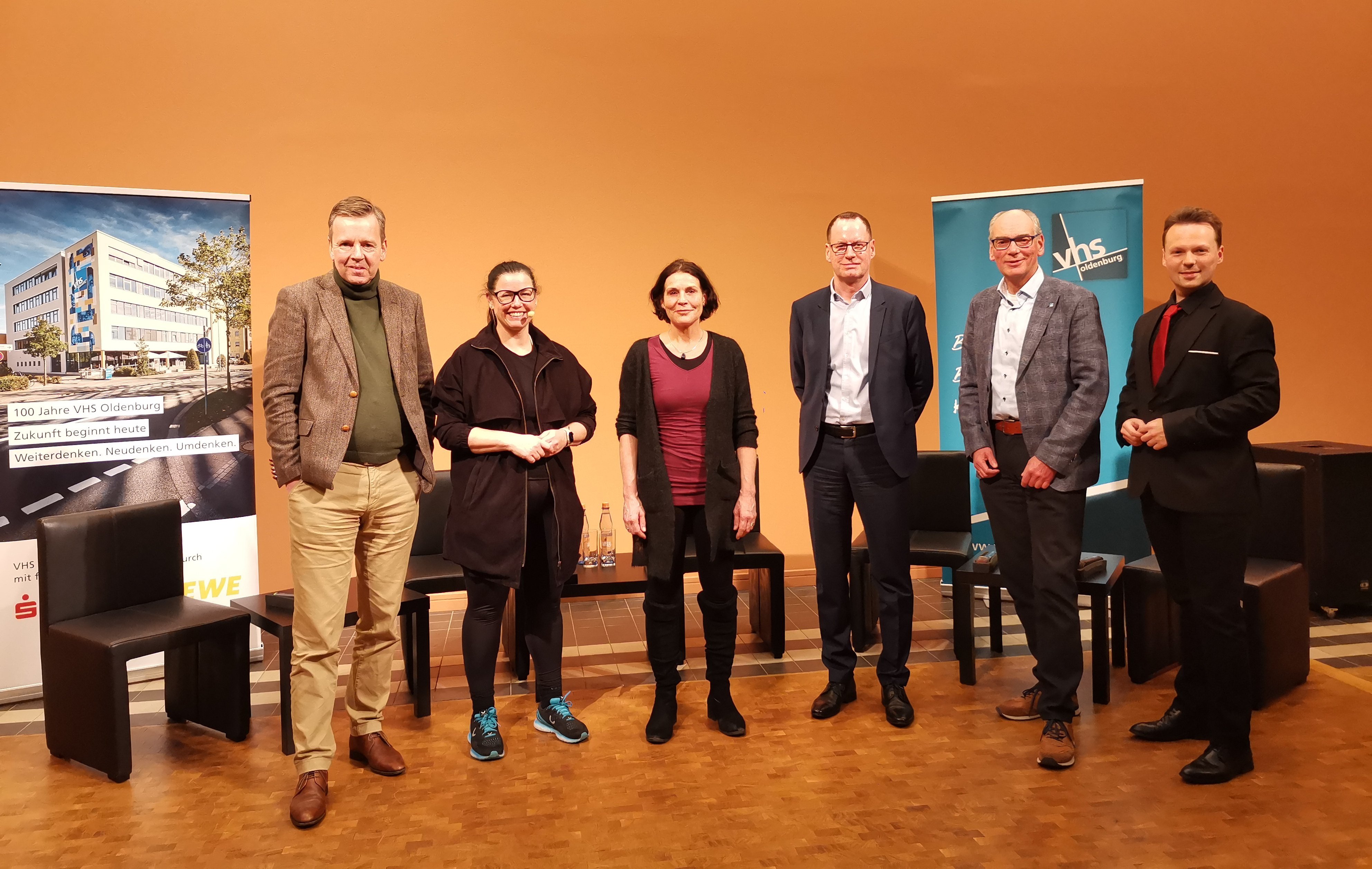 Wie sich dies auf Oldenburg übertragen ließe, war die Frage der anschließenden Podiumsdiskussion. Dafür lud Moderator Andreas Unterberg – neben Sina Trinkwalder – Dr. Katharina Dutz (wissenschaftliche Mitarbeiterin an der Carl von Ossiezky Universität, mit dem Arbeitsschwerpunkt Nachhaltigkeit und Technik), Michael Fuge (Geschäftsführer des Jobcenter Oldenburg) sowie Dr. Torsten Slink (Hauptgeschäftsführer der Oldenburgischen IHK) auf die Bühne.