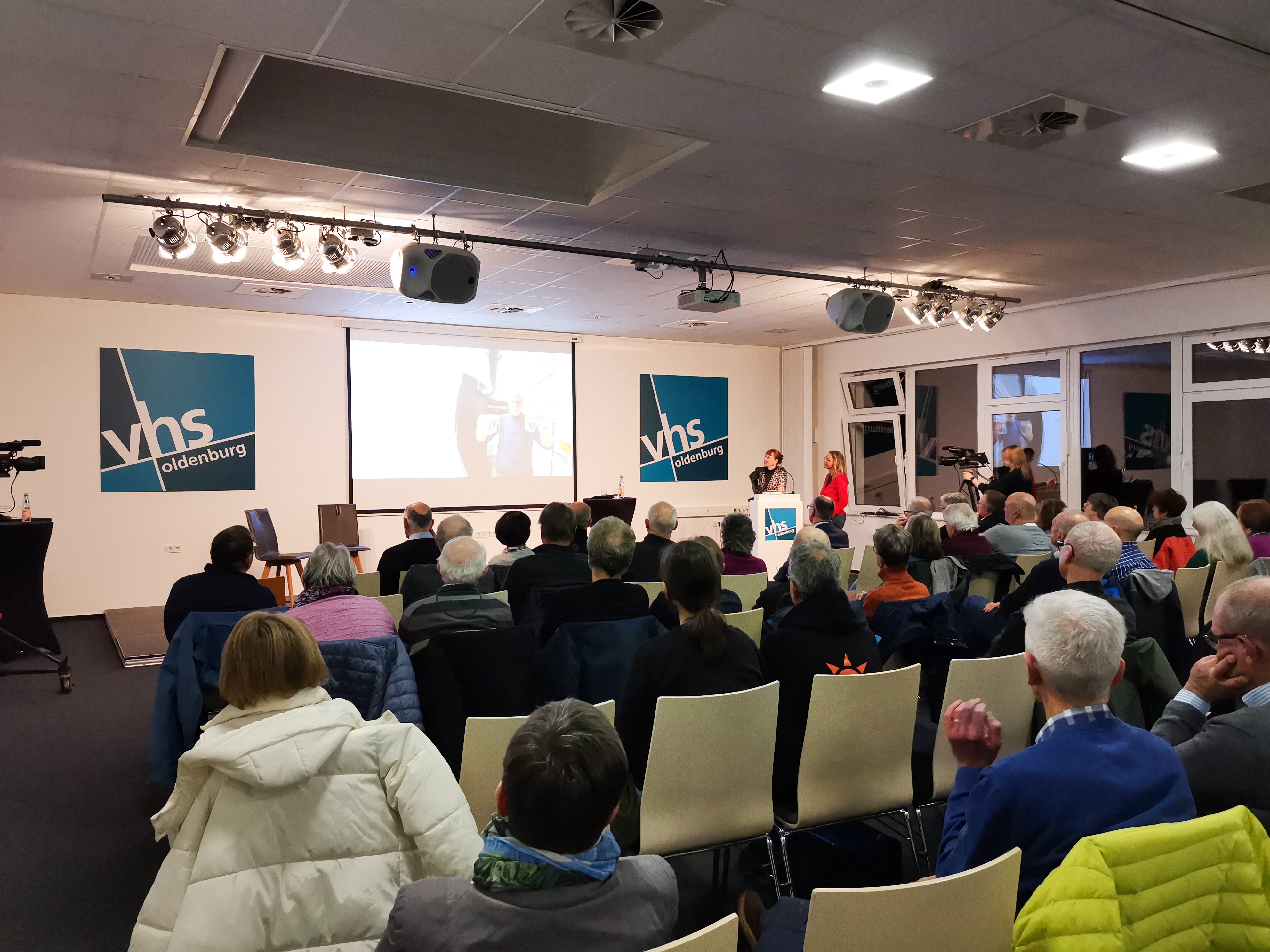 Wie komplex sich die Umsetzung von nachhaltigeren Konzepten gestaltet, zeigte die sich dem Vortrag anschließende lebhafte Diskussion. Auf dem Podium begrüßte die VHS Oldenburg neben den Autorinnen Robert Sprenger, Leiter des Amtes für Umweltschutz und Bauordnung der Stadt Oldenburg, Holger Oeltjebruns, Entwicklungsleiter Wasser und zuständig für die strategische und resiliente Neuausrichtung der Wasserversorgung bei der EWE Netz GmbH, sowie Detlef Kreye, 1. Vorsitzender des Kreislandvolkverbands.